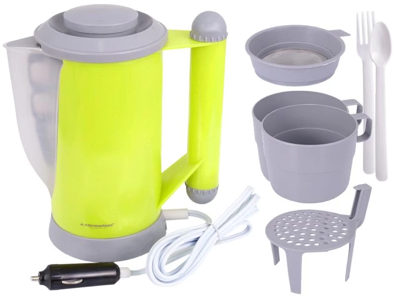 Szivargyújtóról működtethető vízforraló 2 pohárral, szűrővel, kiegészítőkkel.