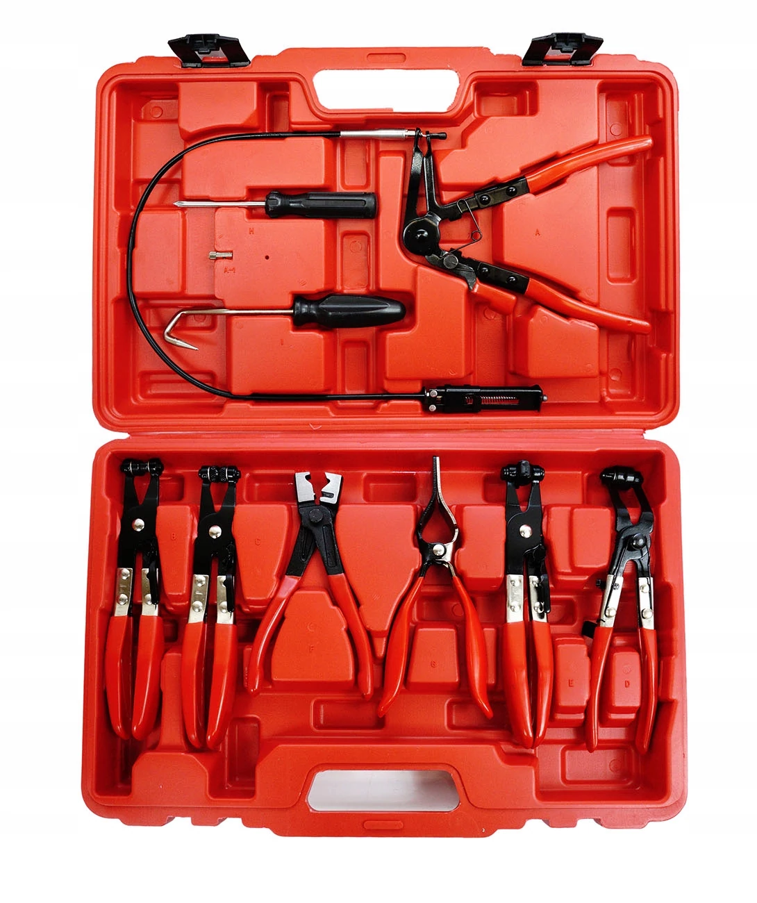 A tömlőbilincs fogó készlettel a tömlőbilincsek rögzítése és levétele pillanatok alatt elvégezhető. Egyszerűvé teszi a csövek és folyadéktömlő bilincseinek, a tömlők, valamint lapos rögzítőszalagok és rugalmas szalagok bilincseinek cseréjét. Praktikus műanyag bőröndös tömlőbilincs fogó készlet. előnyök Csővezetékek és folyadéktömlők bilincseihez, tömlőbilincsekhez, valamit lapos rögzítőszalag és rugós bilincsekhez alkalmazható. Kiváló minőségű szerszámok Szállító bőrönddel szín: fekete/piros más rendezvény tervezéséhez. műszaki adatok Tok (H x SZ x MA): 48 × 28 × 9 cm Anyaga: acél, a bőrönd műanyag Tömeg: 3,3 kg csomagolás tartalma Speciális (kb 630 cm hosszú) bowden szálas bilincsfogó minden 18 és 54 mm közötti rugalmas és önbeálló rugós szalagbilincshez Tömlőbilincs CLIC és CLIC-R tömlőbilincsekhez (hosszúság kb. 180 mm) „+“ felszívódású tömlőszorító rétegek „U“ felszívódású tömlőszorító rétegek Tömlő eltávolító fogó (4 – 13 mm átmérőre) Lapos szalag- és rugóbilincs fogó 45 °-os bilincsszorító fogó Cserélhető nyelű csavarhúzó (réses és kereszt fejhez) Tömlőeltávolító (speciális horog) Bowden szál tartó Műanyag tok