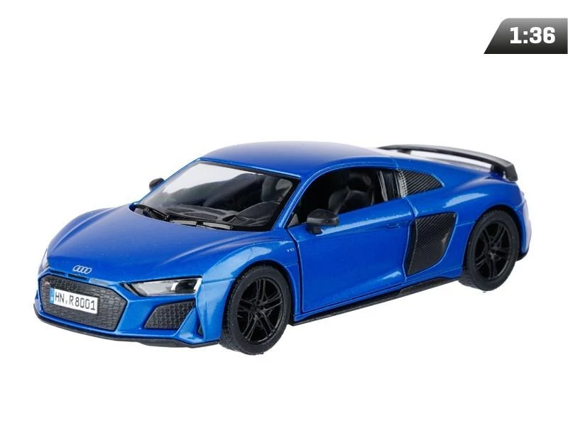 Modell 1:36, Kinsmart, Audi R8 Coupe (2020). A modell fémből és műanyagból készült, visszahúzó hajtással, 1:36 méretarányú. Nyíló oldalajtókkal rendelkezik, amelyeken keresztül bele lehet nézni a modellbe, és gumiabroncsokkal rendelkezik. A modell méretei kb.: 12,5 cm x 6 cm x 3,5 cm . A modell 3 évesnél idősebb gyermekek számára készült. A termék CE európai minőségi és biztonsági tanúsítvánnyal rendelkezik.