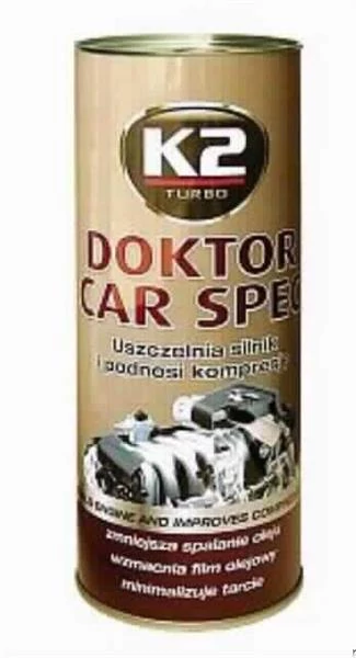 K2 DOCTOR CAR SPEC - motor tömítéshez. Ez egy különleges adalékanyag a motor számára, amely tömítőanyagként szolgál és megakadályozza az olajszivárgást, ugyanakkor csökkenti a füstöltést. A MAGAS JAVÍTÁSI KÖLTSÉGEK megelőzőjének is nevezhetjük. Ez a legújabb generációs termék, amely dúsítva van a nanotech technológiával. Védi a motort az energiaveszteség ellen, és tisztán tartja a motor belsejét. Növeli a motor kompresszióját, hozzájárul az alacsonyabb üzemanyag-fogyasztáshoz és fenntartja a megfelelő kenést, különösen akkor, ha a motor eléri az üzemi hőmérsékletet. Növeli az alkalmazott olajfólia vastagságát és gazdagítja a szintetikus olajokra jellemző tulajdonságokkal. Előnye, hogy bármilyen típusú régi és új motorban használható - benzin-, dízel-, LPG- és CNG-motorokban. Alkalmazkodik minden típusú olajhoz, továbbá ásványi és szintetikus, GL-5 osztályú márkás olajokkal is, a kopott súrlódó felületek lezárása és a motor zajának csökkentése érdekében Nem csak személyautókhoz, de teherautókhoz, autóbuszokhoz, motorkerékpárokhoz és traktorokhoz is alkalmas. Szélsőséges körülmények között működő motorokhoz (dombokon, azaz teljes terhelés mellett) ajánlott. HASZNÁLAT: MOTOR: A kopás mértékétől függően használjon egy K2 DOKTOR CAR SPEC motoradalékot 2–5 liter motorolajhoz. Váltó: A GL-5 osztályú márkás olajokhoz keverje össze a K2 DOKTOR CAR SPEC-t arány: egy csomag 3 liter olajra.